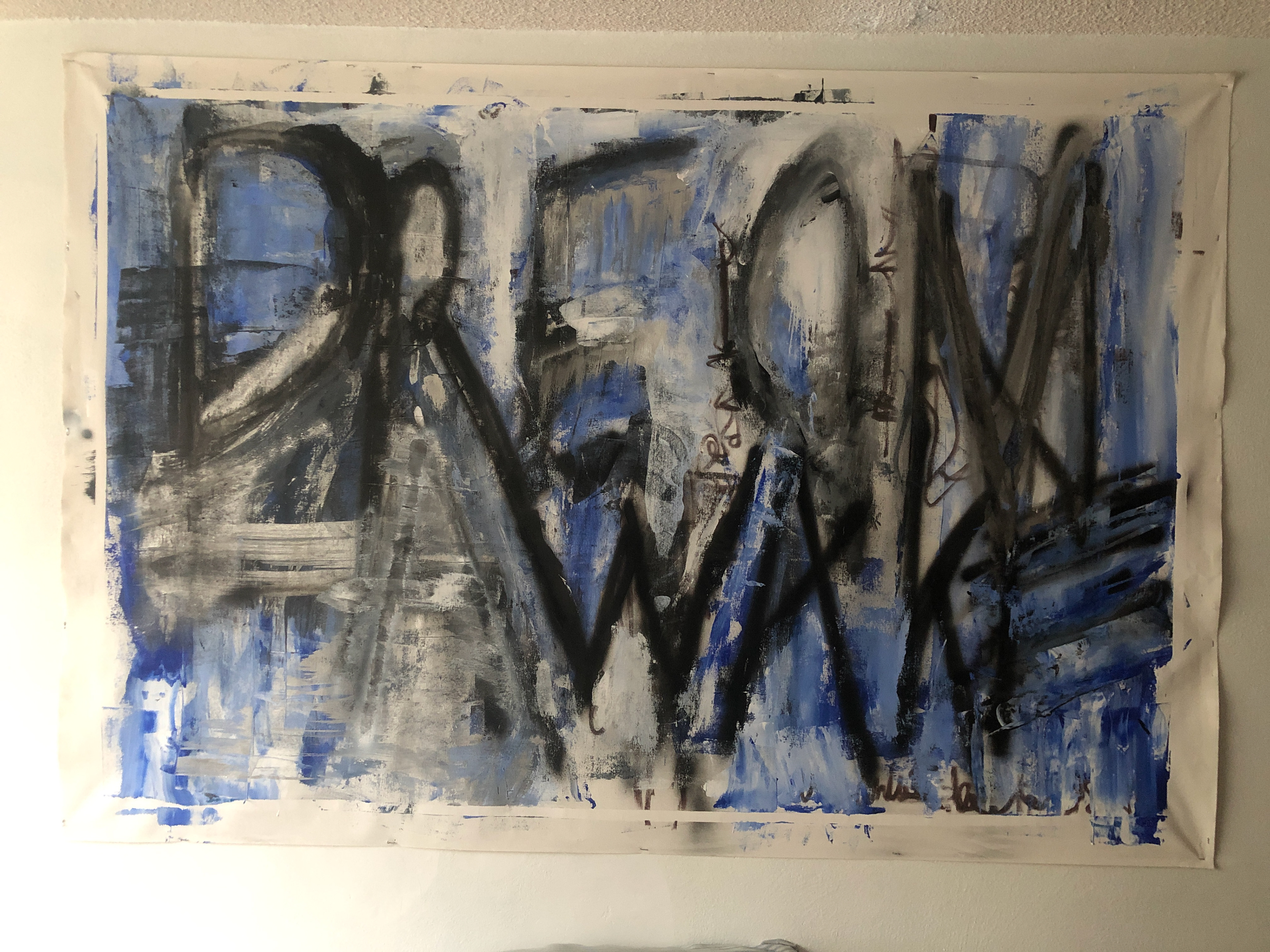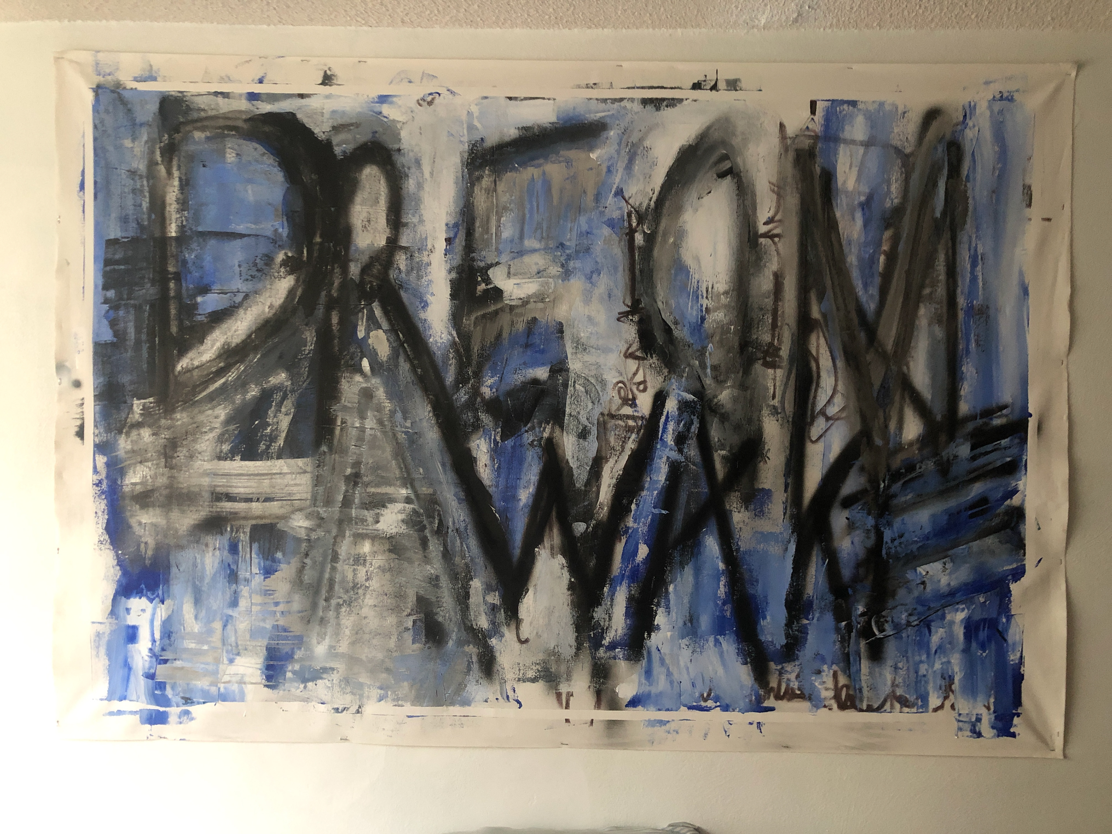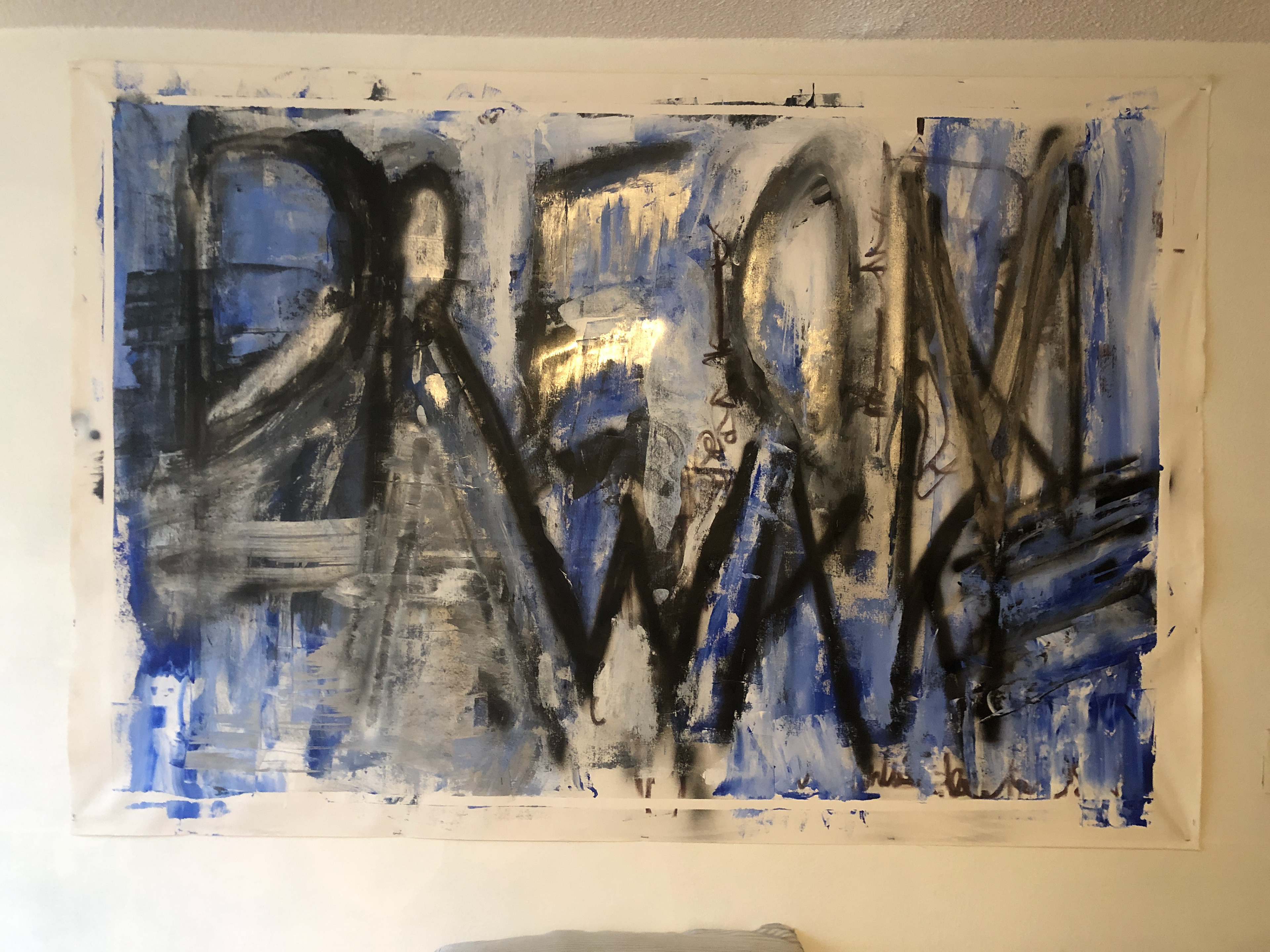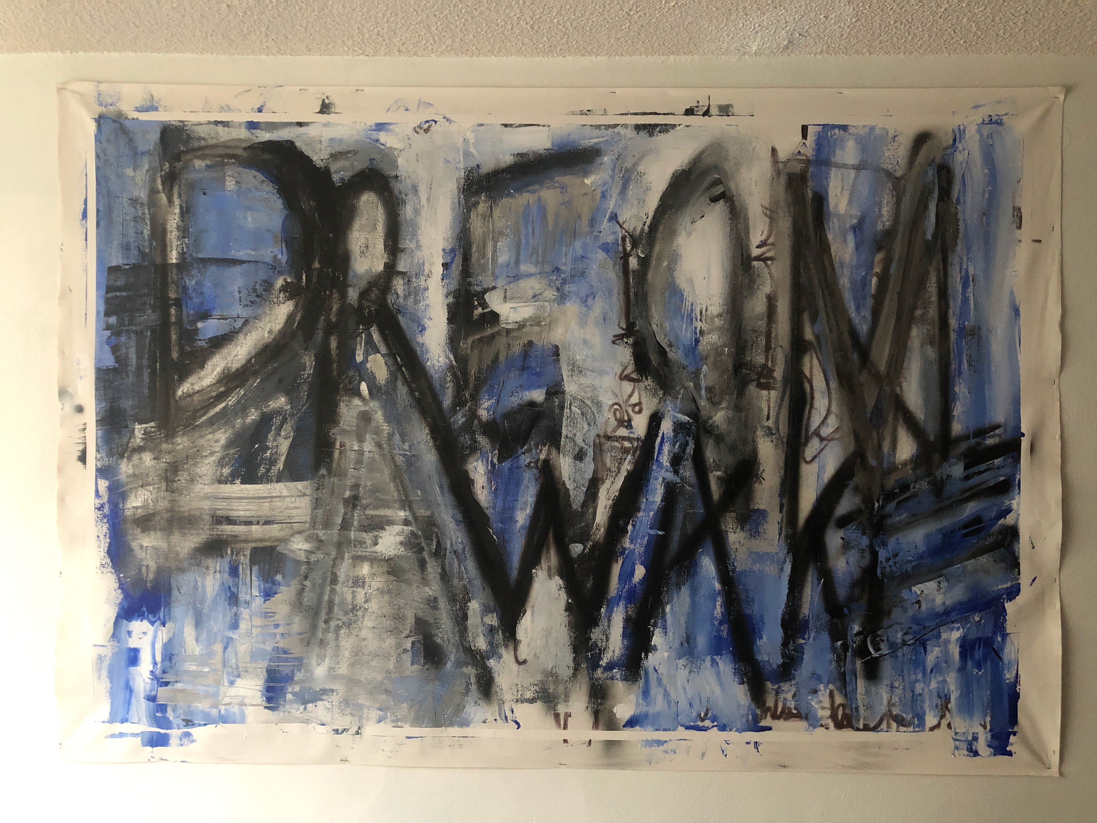 MIXED MEDIA, ACRYLICS AND SPRAY PAINT OVER CANVAS